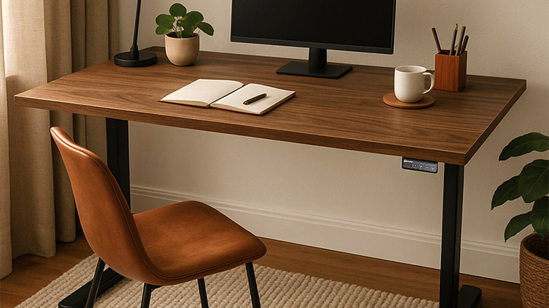 Rich and Ergonomic: The warm walnut finish adds depth and elegance, while the sit-stand frame encourages healthier working habits.